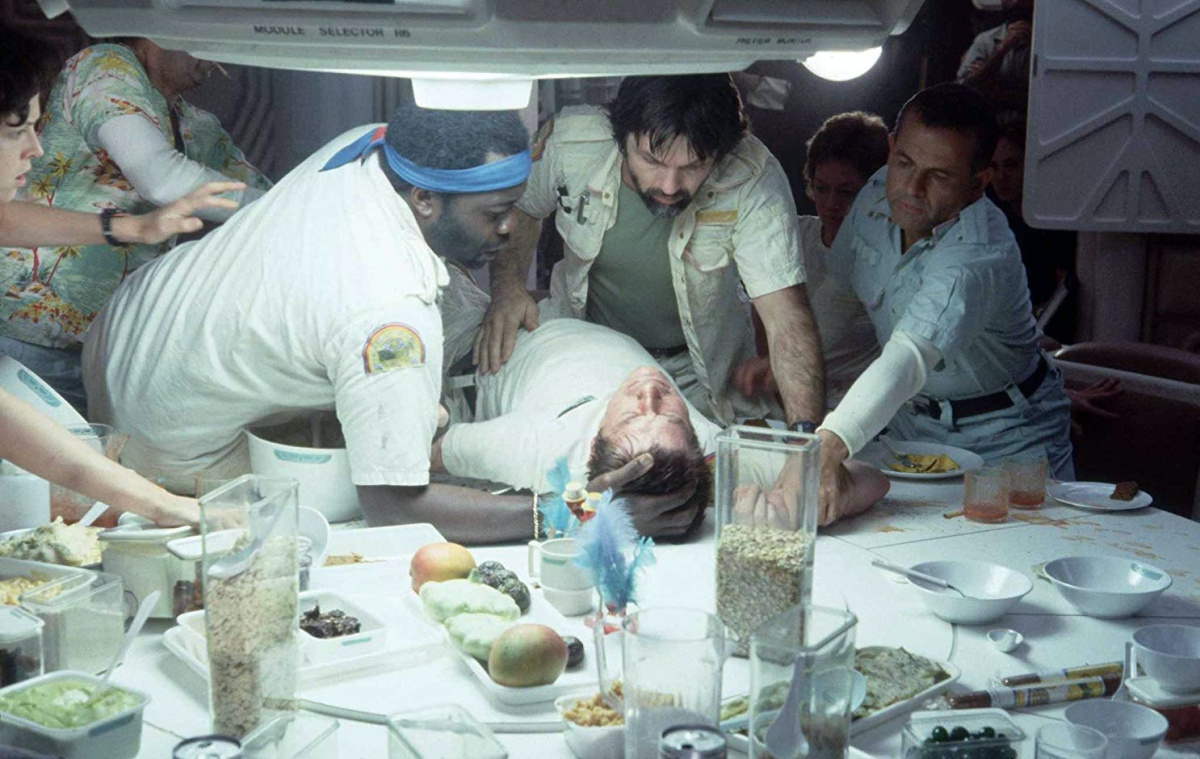 From this point on, shit gets crazy. The three outside crew members explore an alien ship, and Kane ends up finding a bunch of eggs. While he’s leaning over one, it opens, and a facehugger breaks through his helmet and attaches itself to his face. When the crew tries to bring Kane back aboard the Nostromo, Ripley, who is technically in command, says they can’t let them in because of the need for a 24-hour quarantine. If only they had listened. Ash overrules Ripley and lets them in, and because of that, the majority of the crew is doomed to death. The facehugger implants an alien baby inside of Kane, and it explodes from his chest during dinner (rude), and the rest is man vs. monster in its purest form.