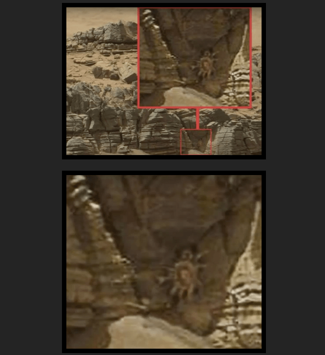 Do you see an alien crab in this photograph of Mars, taken by NASA? Look very closely … perhaps at this zoomed-in version by UFO Sightings, presumably created by someone shouting “ENHANCE!” at Photoshop a lot.