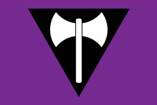 The labrys (double-headed axe) was designed as a symbol of lesbian power in 1978 by artist Alisa Bierria for her art project “Public Art Wares,” in response to Anita Bryant’s anti-gay “Save Our Children” campaign from the previous year. The labrys is an ancient Greek tool associated with work traditionally designated for women, but the double-sided axe is also associated with the Amazons. Purple represents women, feminism, and all people who identify as a woman attracted to other women, while the black triangle represents lesbians.