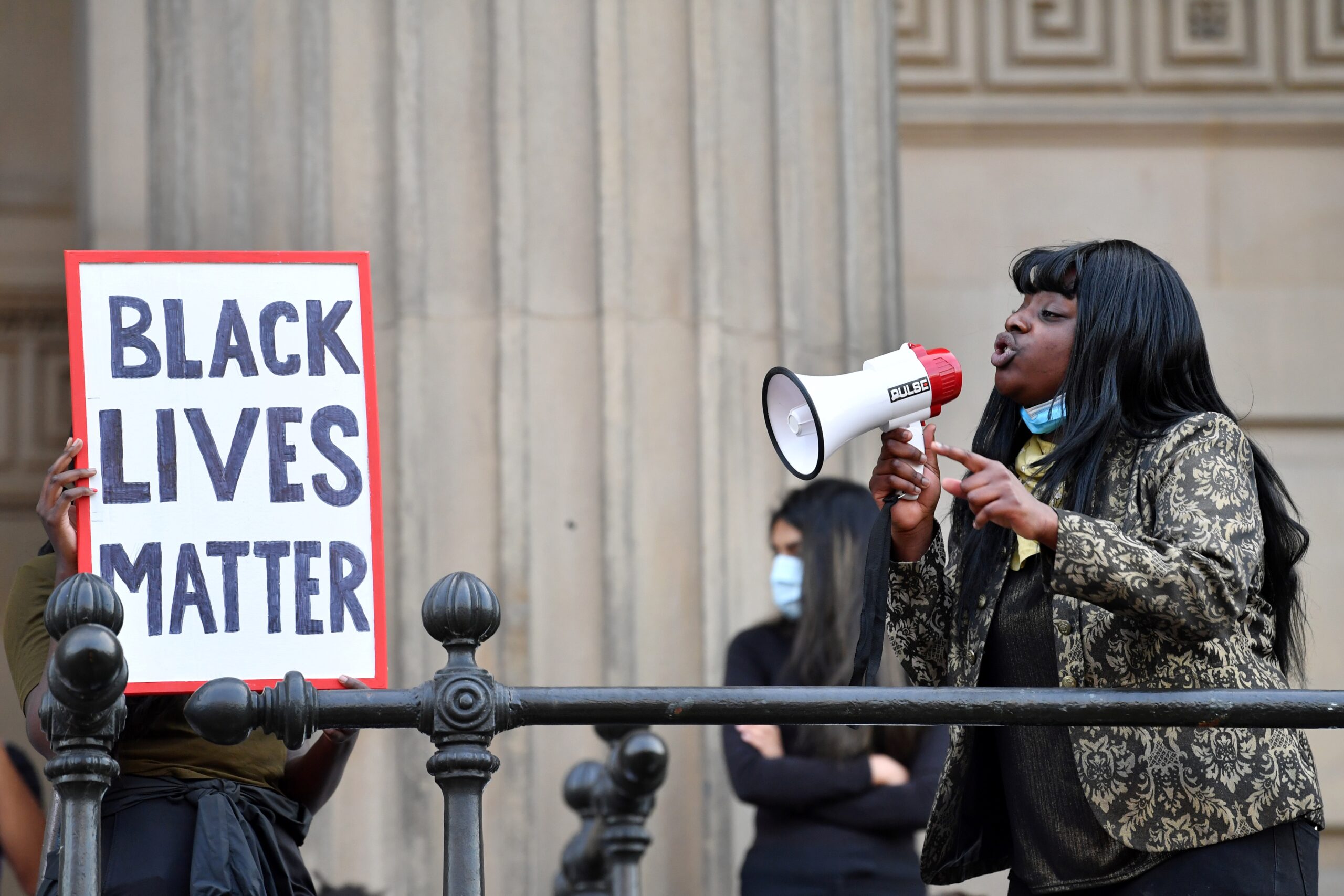 A protester addresses others through a megaphone as another holds a placard with the lettering reading 'Black lives matter' in Liverpool, northwest England, on June 2, 2020, during a demonstration after George Floyd, an unarmed black man, died after a police officer knelt on his neck during an arrest in Minneapolis, USA. - The city of Liverpool lit up their civic buildings in memory of George Floyd on June 2 the death of whom in Minneapolis while in police custody has sparked days of unrest in the US city and beyond. (Photo by Paul ELLIS / AFP) (Photo by PAUL ELLIS/AFP via Getty Images)