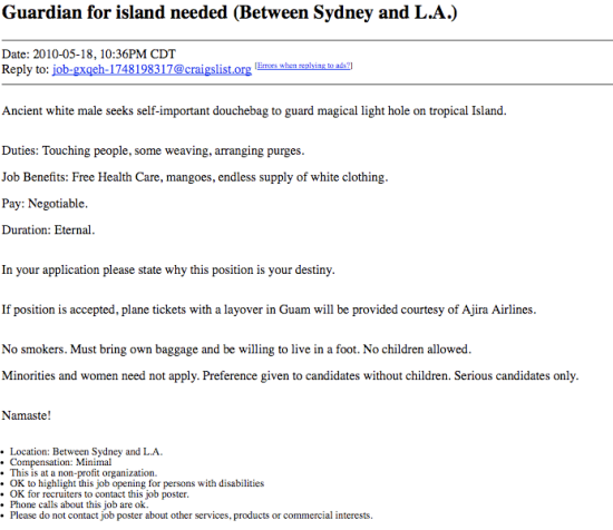 Craigslist Ad: “Ancient White Male Seeks Self-Important D-Bag to Guard Magical Light”
