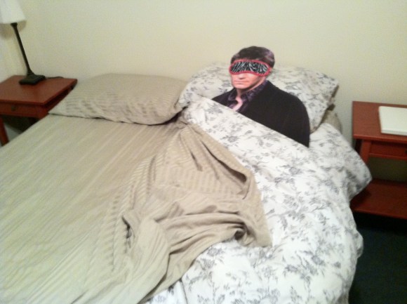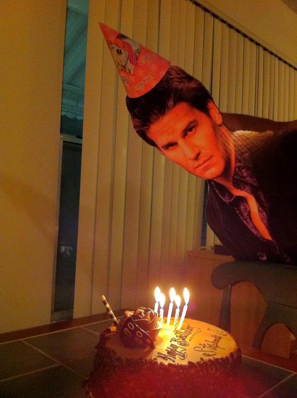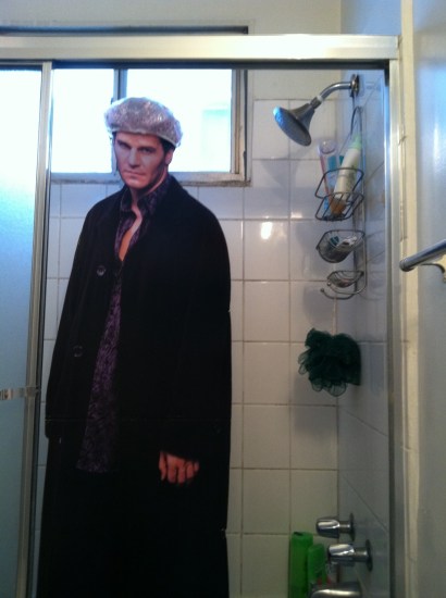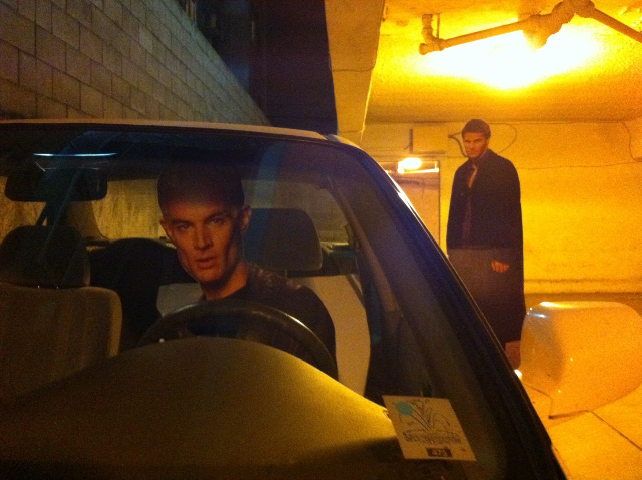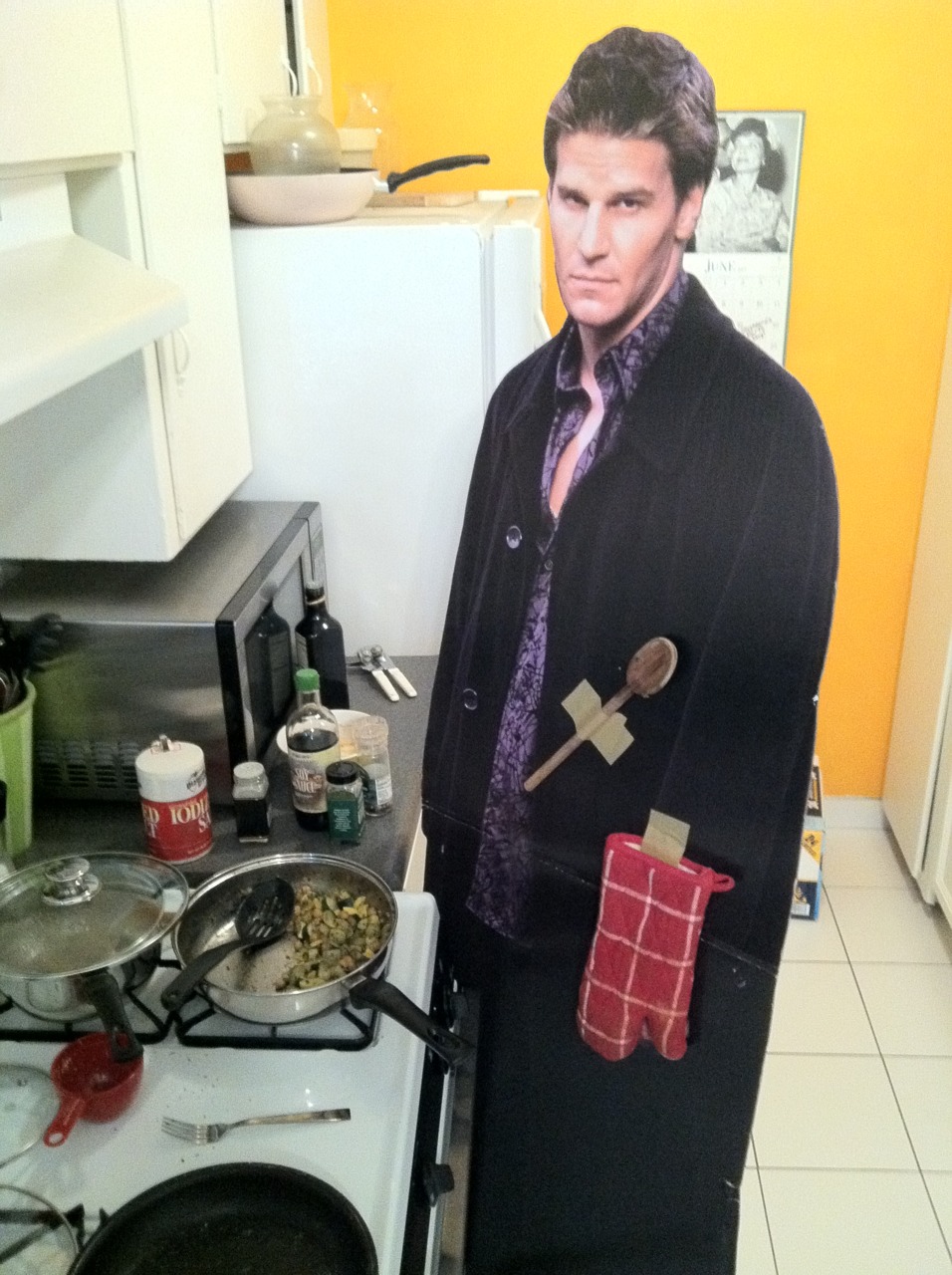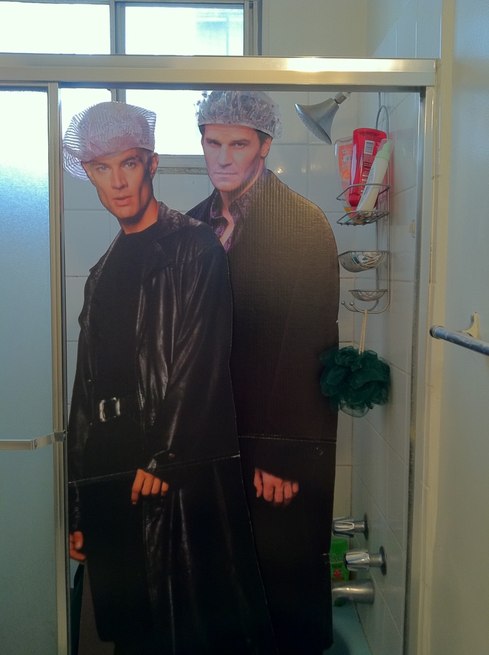 Someone has a life-sized cutout of David Boreanaz as Angel. This same someone has taken to Tumblr and posted pictures of Angel doing things. If you can’t pinpoint why this is funny, look at his face. Now think of a cat who has been dressed in clothing. And now you know why this is funny. After the jump, see more things that Angel is doing.