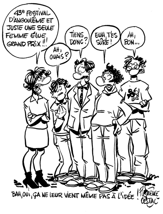 If you don’t speak French, Cestac’s comic depicts a woman pointing out to several men that in 43 years, only one woman has ever been recognized with this honor. The men shrug and hem and haw and “gosh, really?” in response. The caption says, “Of course, this idea has not even occurred to them.”