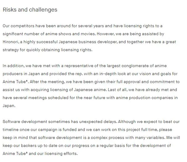 When you check the FAQ you will see a question about what regions will be supported. This is an important question when it comes to streaming, particularly in the case of anime. For example, Studio Ghibli movies are streamable on Netflix … except if you live in the US and Japan. Different regions have access to different anime, hell, certain streaming services don’t even exist in certain regions, so knowing if the service you’re backing will even work is crucial.