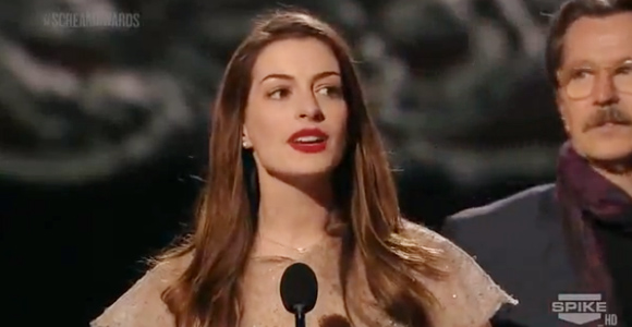 Umm, so yeah, Anne Hathaway is quickly becoming my favorite person. First she rapped about paparazzi, now she shows us her impersonation talents on the Spike TV Scream Awards. Yo Gary Oldman, you’re a great character actor and all but Anne Hathaway is the greatest impersonator of all time.