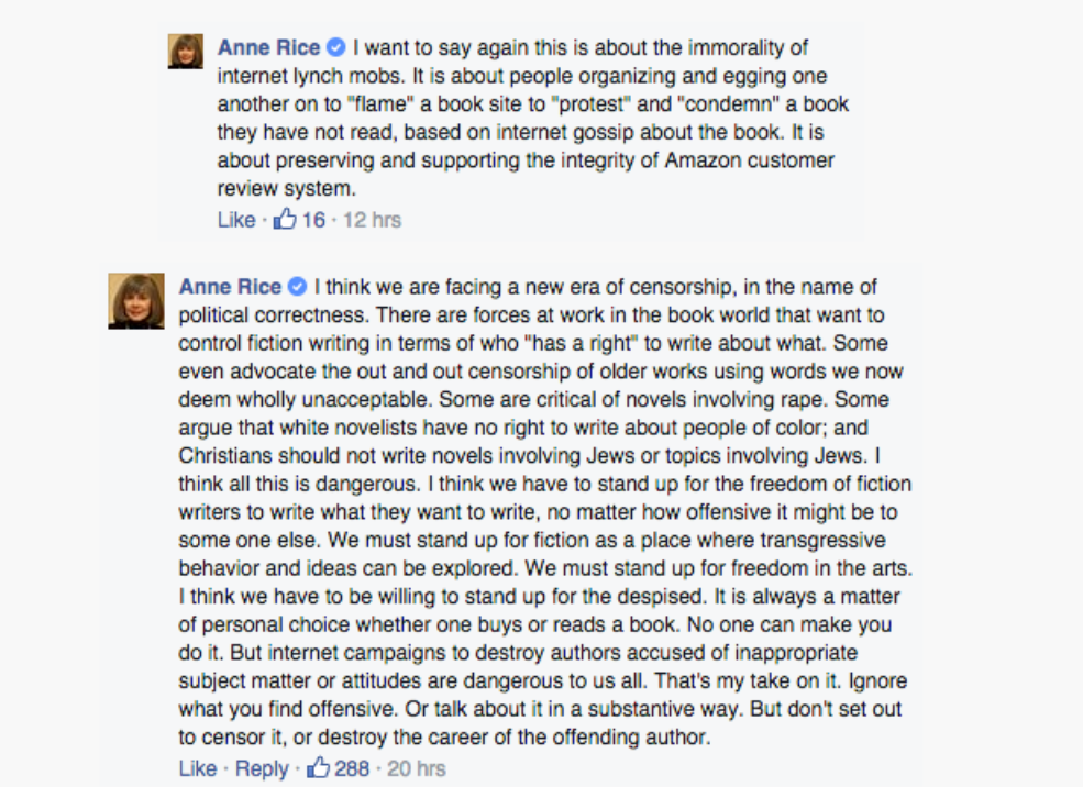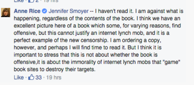 Rice, (who has a bit of a history with “internet mobs,” herself) went on to explain that she personally has yet to read the book, but that its subject matter should be irrelevant: