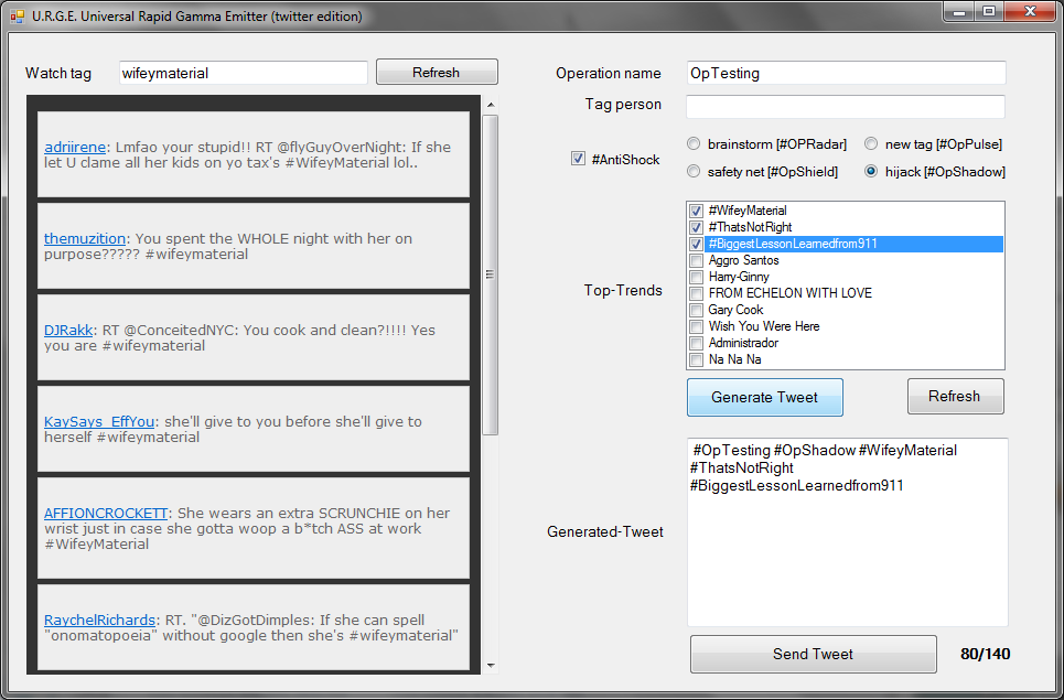 We recently have become tired of seeing trending topics on twitter that were redundant and “pop culture” like. We have also grown tired of Twitter not trending hash tags that actually serve a cause and mean something to free thinkers of the world. We have taken note of why Twitter would not do so, they only trend topics which would “appeal” to people and can get people to tweet more. This was pathetic in our eyes, and we could not stand by and take it anymore. We have developed a program called “U.R.G.E. Universal Rapid Gamma Emitter (twitter edition)” which hijacks trending topics of our choice and and lets us tweet messages within them. This will help raise awareness of problems going on in this world and show people that real problems exist outside of “Jersey Shore” and “Sex”. We will distribute this program amongst Anonymous and anyone else who cares to use this for awareness and bashing corrupt politicians. This is not a hacking tool nor is it an exploit tool, it was created to make it easier for us to tweet faster without copying and pasting constantly.