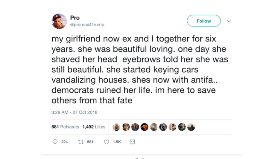 It’s a tale as old as time: boy meets girl, boy loves girl, girl shaves off her hair and eyebrows and joins the antifa—at least according to Twitter user promax4trump (whose account has been suspended), who tweeted the following a few days ago: