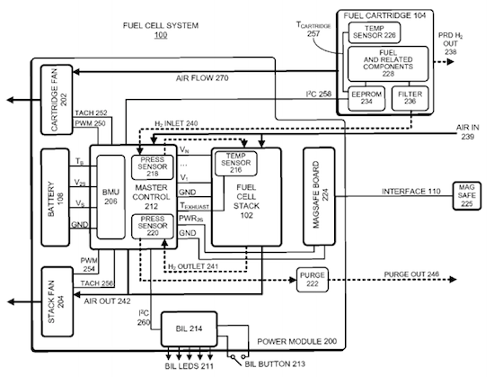 A cleverly devised system, the patent for the actual system describes a device that can both provide power to, and receive power from, a rechargeable battery within the portable computing device. Something like circular breathing, but for batteries. It is proposed that the fuel cell system could include a fuel cell stack which would convert fuel into electrical power — kind of the whole point.