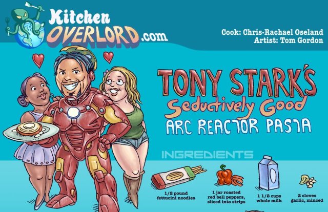 Iron Man 3 opens this weekend, and sure, you could just go see the movie, or you could make a night out of it by preparing Tony Stark’s Seductively Good Arc Reactor Pasta. That’s right, in Kitchen Overlord’s quest to make all food more awesome, nerd-chef Chris-Rachael Oseland created a recipe to make fettuccine alfredo look like an arc reactor. There’s even a handy graphic.