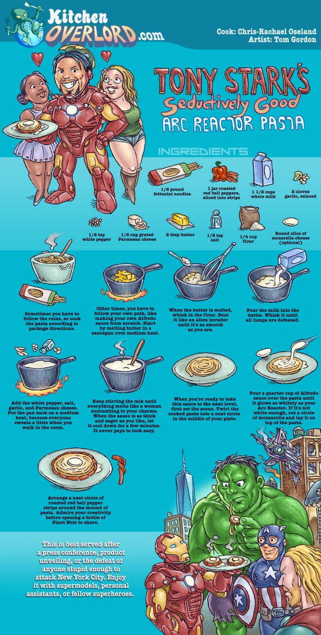 As with other recipes we’ve seen from Overlord Oseland, this focuses more on presentation than anything else, though alfredo sauce is pretty easy to manage from scratch. The goal here is to make the plate look as much like an arc reactor as possible. Short of making a luminescent sauce, I think she nailed it. Check out this graphic by artist Tom Gordon for the recipe: