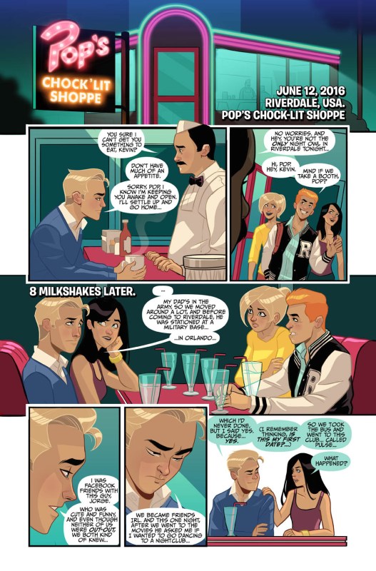 You’ll notice that the style of the artwork is from Archie Comics’ “New Riverdale” comics, which Aguirre-Sacasa says exists in our world, making it the perfect place to address this national tragedy. According to a statement from Archie Comics, Aguirre-Sacasa said, “When Marc Andreyko [Love is Love editor] approached me and Archie about including a story in Love is Love, I knew we had to be a part of it—and that we also had to approach it in a direct way…We often talk about how ‘Riverdale’ exists in the real world today, so we’re incredibly honored to be paying our respects to the terrible tragedy that happened in Orlando, along with so many of our colleagues in the industry.”