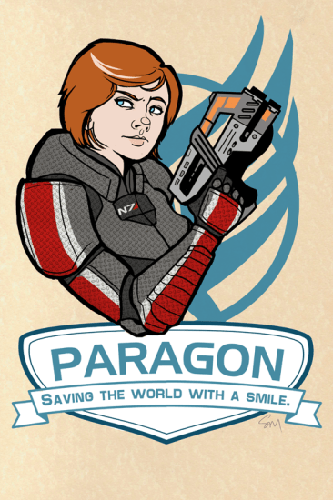 Mwar has twin Paragon and Renegade posters, depicting the two moral alignments you can walk down as Commander Shepard, featuring a friend’s Renegade FemShep, and her own Paragon FemShep.