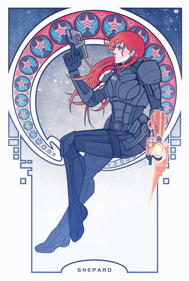 Kotaku brought this fabulous FemShep poster in the Art Nouveau style to our attention this morning, and after poking around Mwar’s DeviantArt gallery we found even more goodies. Generally when I see fan art done “art nouveau” style, it’s in imitation of musical hall posters of the early 1900’s and the characters are depicted lounging or standing… the composition is always gorgeous but the ladies generally look passive and unfocused. Not so for these pieces, full of guns held at the ready and alert and piercing looks. More behind the jump.
