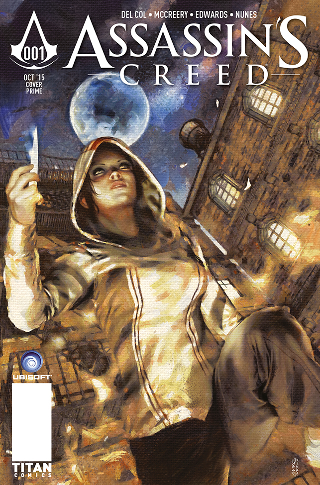 Titan Comics’ upcoming comic adaptation of the Assassin’s Creed games will star a brand new lady assassin character named Charlotte de la Cruz; she sports the iconic hooded look in several of the variant covers released today. The cover above by Marco Turini displays Charlotte brandishing a knife with a grim glare. This next cover by Adam Gorham displays the heroine performing an acrobatic flip off a rooftop: