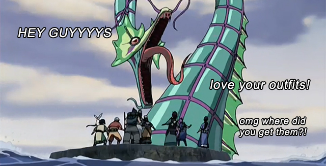 A Fire Nation ship spots them and starts shooting fire balls, and everyone survives, but it’s revealed that Sokka’s feeling very protective toward Suki. She tells him that she can take care of her own damn self, thank you very much, but she doesn’t get angry at him or anything. I think because she senses there’s some deeper issue here, even if she doesn’t know what it is. “His girlfriend turned into the moon” probably isn’t something she would have guessed.