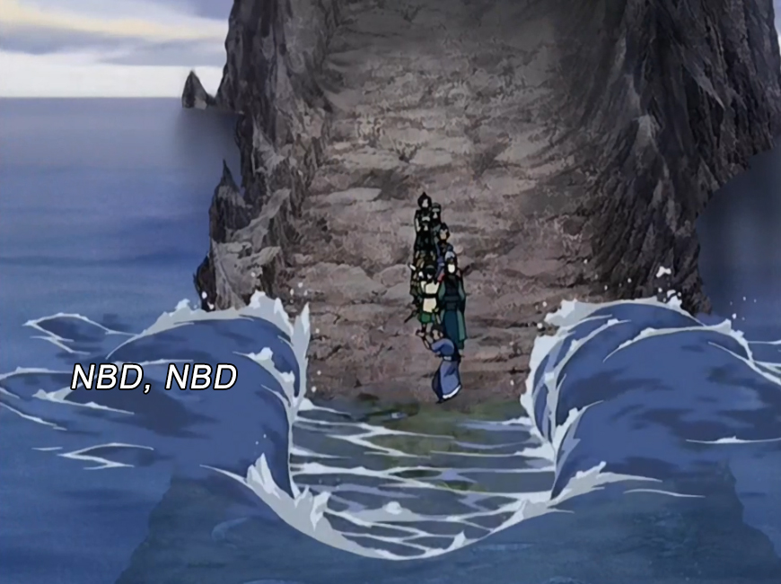 Our Heroes make their way to a part of the path that’s submerged under water. Katara FLIPPING MOSESES THAT STUFF and gets them part of the way across pretty easily…