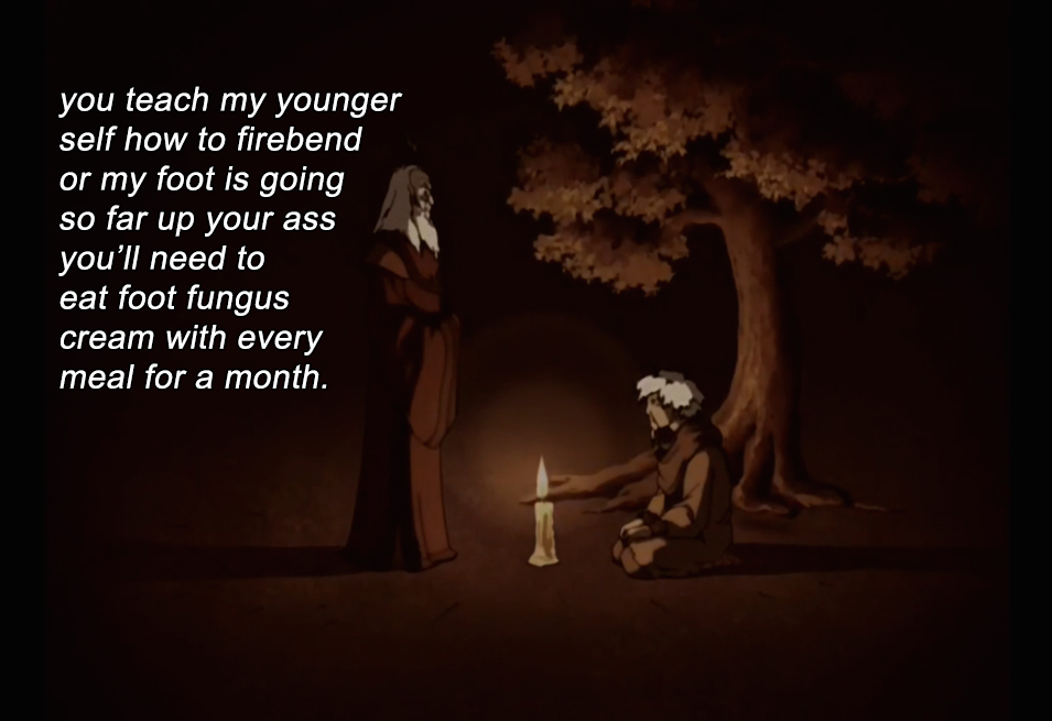 That’s when Avatar Roku appears to tell Jeong Jeong to stop being a fucking asshole.