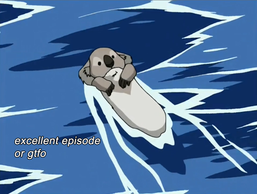 The episode ends with Paku—who’s less of a snarky jerk now—teaching Aang and Katara how to be (non-healing, warrior-type) waterbenders. I love how Aang drove like… zero percent of the action this episode. The plot was about girls not being allowed to be warriors, and it was ALL KATARA who got shit done.