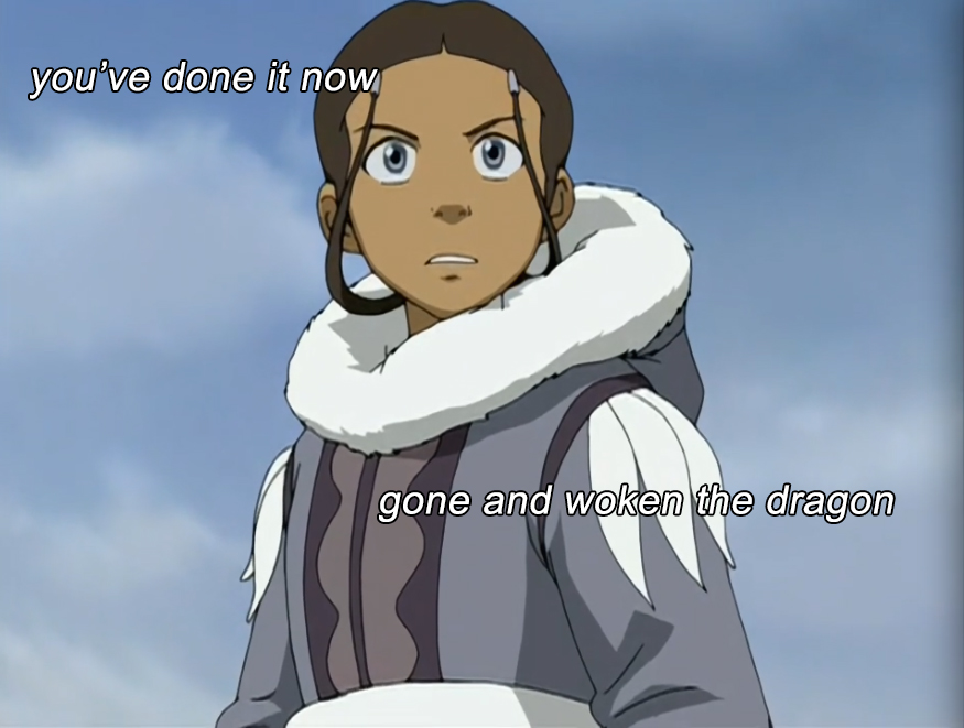 Aang, having won the fight by using Zhao’s own aggression against him, peaces out with Katara and Sokka, who bicker about Katara’s newfound healing abilities.