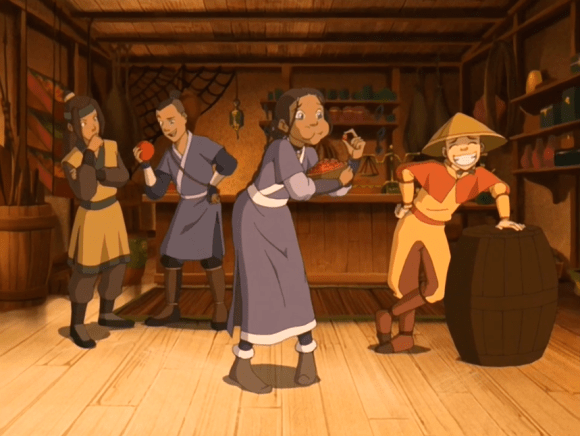 They follow him to his village, which has been taken over by evil, eeeeevil Fire Nation soldiers who’ve abducted all the earthbenders. After Our Heroes formally meet the earthbender, Haru, and his long-suffering mother, said Fire Nation soldiers make an unannounced visit. Sokka tells everyone to act natural: