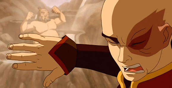 Uncle Iroh escapes from the earthbenders—because crouching tiger, ancient badass—but only temporarily. They are about to crush his hands with rocks when Zuko shows up to save the day. He saw Appa flying around with Katara (because like she’s gonna stay home when she could be looking for Aang and Sokka, oh please) and assumed it was Aang, but instead of going after the Avatar he decided to rescue his uncle instead. And he does it in a badass, dramatic way.