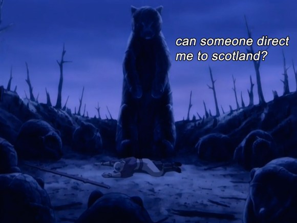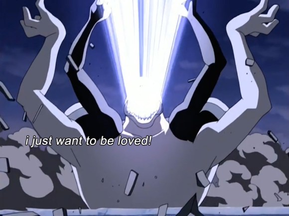 Sokka sees that Aang is getting his ass handed to him and tries to help, even though everyone else is all “Nooooo, this is something the Avatar has to do himself!” Reminds me of that scene in Firefly (“Jayne. This is something the captain has to do for himself.” “No, no it’s not!”). Unfortunately, Sokka’s fighting spirit gets him kidnapped. Aang zooms through the forest after them and gets knocked out after landing a clearing with a statue of the Mor’du the bear from Brave.