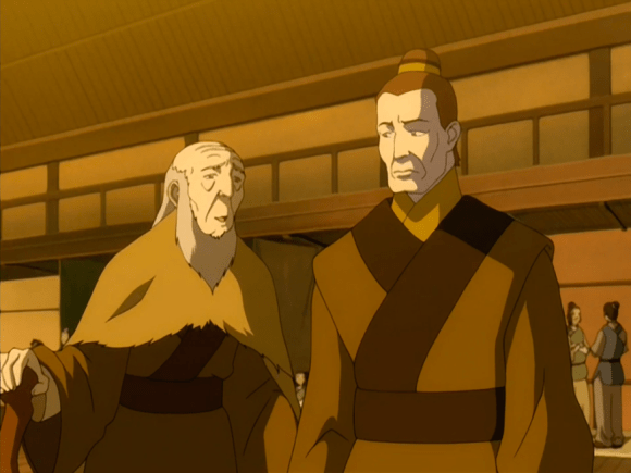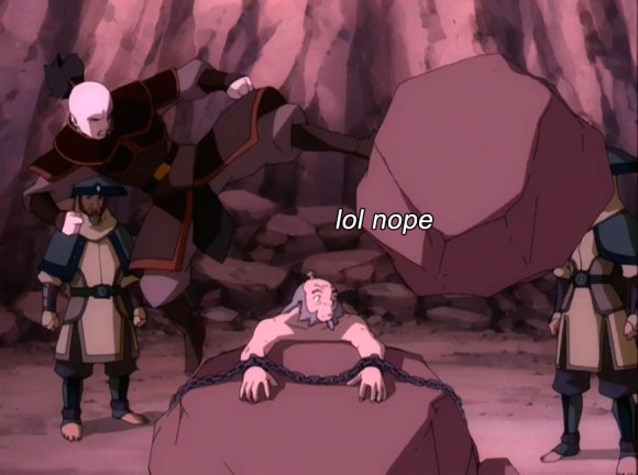Uncle Iroh’s trying to get his nephew to unwind a little by taking a hot bath, but Zuko’s all “MY TROUBLES CANNOT BE SOAKED AWAY.” Angst baby with your angst. Iroh’s love of relaxation gets him abducted by Earth Nation soldiers, who refer to him as “the dragon of the West” and “the once-great general.” Excuse you. Once great? Did you see that dude’s sideburns? What more proof of greatness do you need?
