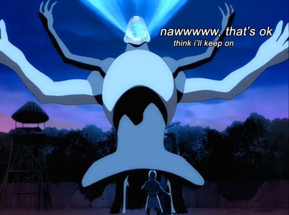 Aang does the knowledge transfer thing the spirit dragon taught him and finds out that Hei Bei is actually just a friendly panda forest spirit who Hulked out when the Fire Nation got destruction-happy in his territory. Aang calms it down by showing it the acorns Katara showed him, because even when she’s not even involved in the fight Katara’s still saving the day. Hei Bei’s like “yeah OK” and lets his captives, including Sokka, loose.