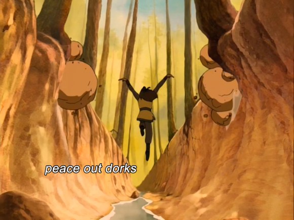 There’s an epic firebenders vs earthbenders fight, and eventually the latter come out on top. Haru and Tyro both bend over backwards to thank Katara, as they should, because she totally saved not only their asses, but also the collective asses of a whole buncha tiny Earth Nation villages. Now that Tyro’s out of prison, he’s ready to wreck some Fire Nation punks and shove them out of his land. Haru wants Katara to come with them, because he’s in lurrrrrrve, but she tells him she has to get Aang to the North Pole. Oh, if only there were something Haru could do to repay Katara….