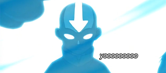 Aang, freed from his iceberg after what we later learn is effectively a century-long coma that caused him to miss all the FIRE NATION ATTACKING, turns to Katara and immediately asks her