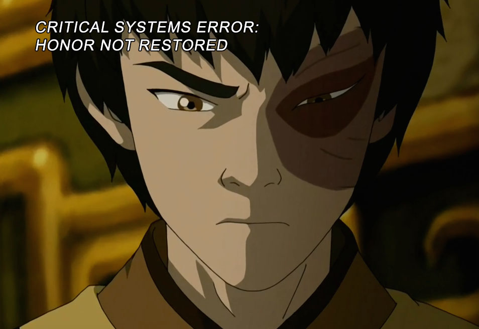 God damned honor. Zuko could get an email from a “Nigerian prince” offering to restore his honor in exchange for his entire life saving’s and left kidney, and Zuko would fucking fall for it. Why do I always fall for characters who make awful decisions all the time? First THIS FUCKER: