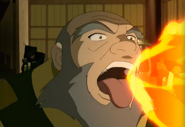 The fact that he can literally breathe fire makes his escape from Azula pretty easy. But Zuko refuses to follow, saying that he’d rather confront Azula once and for all than keep running from her. Cue Iroh’s literal facepalm at his nephew’s poor decision-making skills (the first of many times they will pop up this episode):