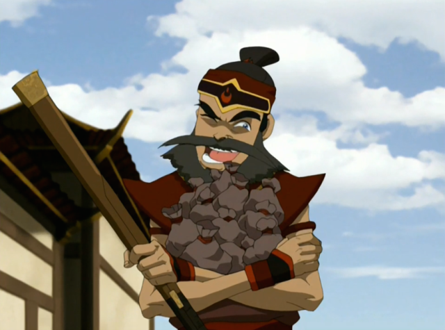 Toph causes Sparky’s powers to go a little funky by hitting him in the forehead eye with a pebble, while I’m guessing will be significant later. As the group escapes, Sokka says he’s come up with a perfect name for their nemesis: Combustion Man. Uh, no, Sokka. You already said Sparky Sparky Boom Man. You can’t give me that and then take it away. I know what I want.