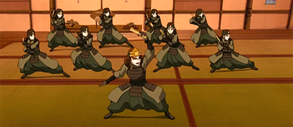 Sokka, meanwhile, goes to check out those girls who kicked his ass. He apologizes for interrupting their “dancing lessons,” calls them “just a bunch of girls,” and boasts about being the best warrior in his village of, like, 13 people. Kick his ass, ladies. Kick his ass for his own good. The main lady, Suki, does. And how.