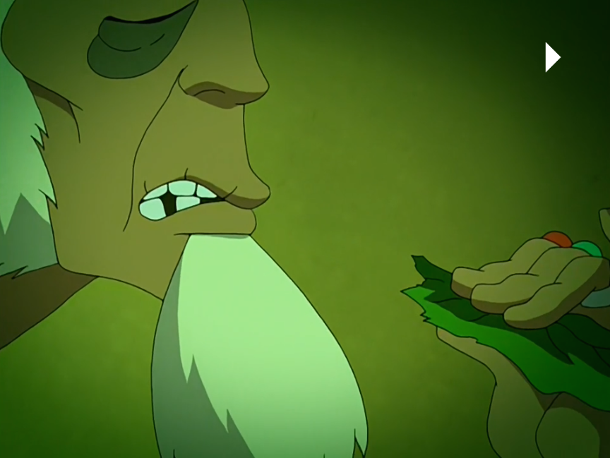 Aang disguises himself as an elderly grandfather to keep his Avatar identity secret, and he gets really into it, calling Katara nad Sokka “young whippersnappers” and threatening to spank the guard. Right after he gets into the city Momo pops up from Aand’s “wig,” breaking their cover. But none of that is as important as the introduction of Cabbage Man, who from what I’ve seen of fandom is, like, the most important character in this whole series, even if he probably only shows up in this one episode.