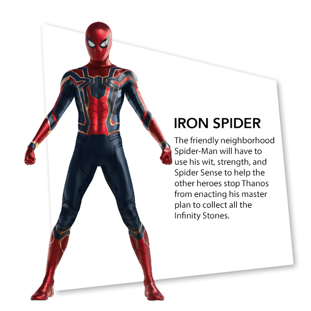 What do we see here? Our little Petey’s growing up and seems to be pretty prominently featured in Infinity War merch as “Iron Spider” in his new suit. This placement suggests that his role is going to be considerably more significant here than his fun extended cameo in Civil War. The Tony Stark-designed suit may not be a Shuri original, but it’s sleek and snazzy, and likely has some pretty big tricks up its sleeves—like, oh, some extra arms?
