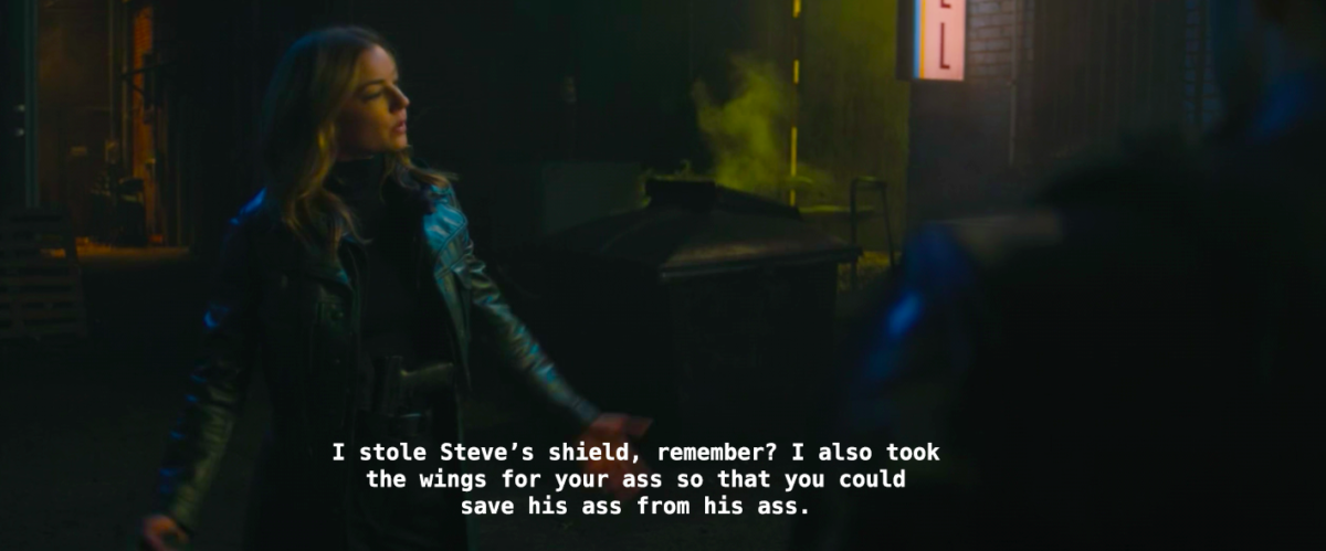 In the alleyway, they see a hooded figure some into the light only to have Sharon Carter reveal herself. The problem though is that she is in Madripoor because, unlike Steve, Sam, and Bucky, she’s still wanted by the U.S. Government for stealing Steve’s shield and Sam’s Falcon wings so that they could save Bucky Barnes in Captain America: Civil War.