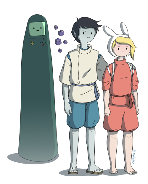 There’s Fionna, Marshall, and BMO as Chihiro, Haku, and No-Face (And I’m guessing some Lumpy Space Soot Sprites.),