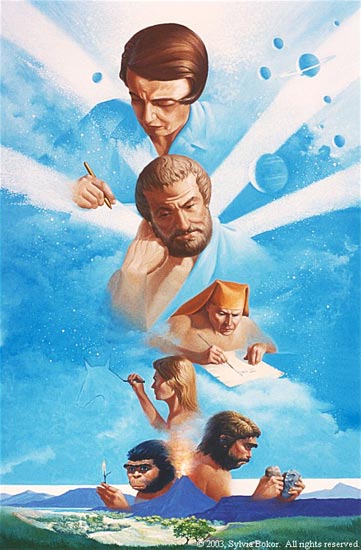Artist and author Sylvia Bokor, who you can follow on Twitter at “@BokorCapitalism,” painted the above work of art, which a tipster passes along. Titled “Beginnings,” it depicts, from bottom to top, a Homo erectus discovering fire, a Neanderthal working with stone tools, a prehistoric artist painting a horse, “an Ancient Egyptian scribe writing on a piece of papyrus,” an Aristotle, and at the pinnacle of it all, Ayn Rand, flanked by Saturn, miscellaneous planets, and electro-sky bolts, because she is the zenith of human development.