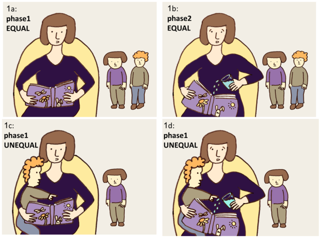 The actual scientific study was done by placing a child and their mother in a room with another child. In one instance the mother read a book out loud while the kids played, and was signaled to “accidentally” spill water on the book. In the other instance, the mother read the book out loud with the other child on her lap while her own child looked on. She again spilled water on the book.