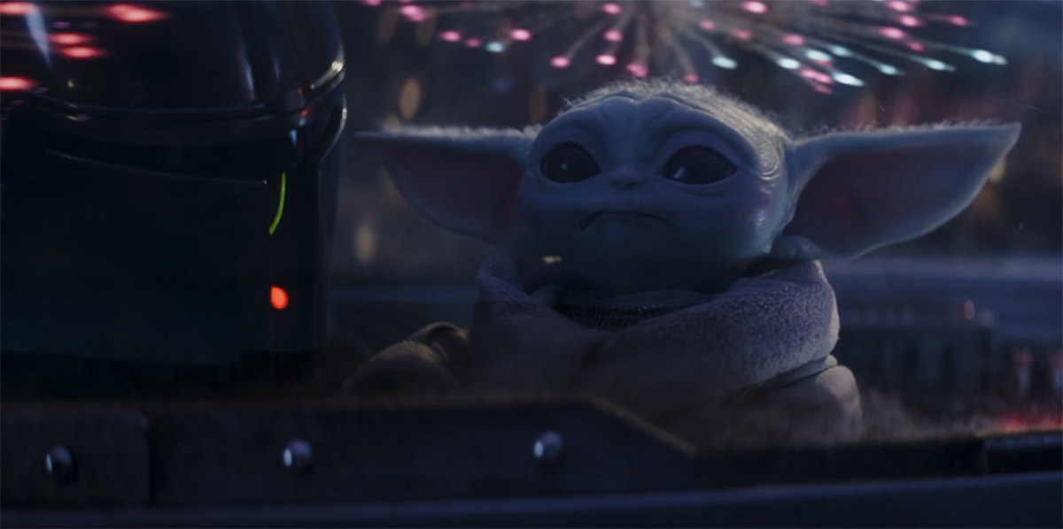 Din and Peli’s conversation is more about parts and her trying to sell him a droid instead. Then, as they go to leave Tatooine, fireworks are happening and Grogu is watching them explode in the sky above them as he flies off with Din in his seat.
