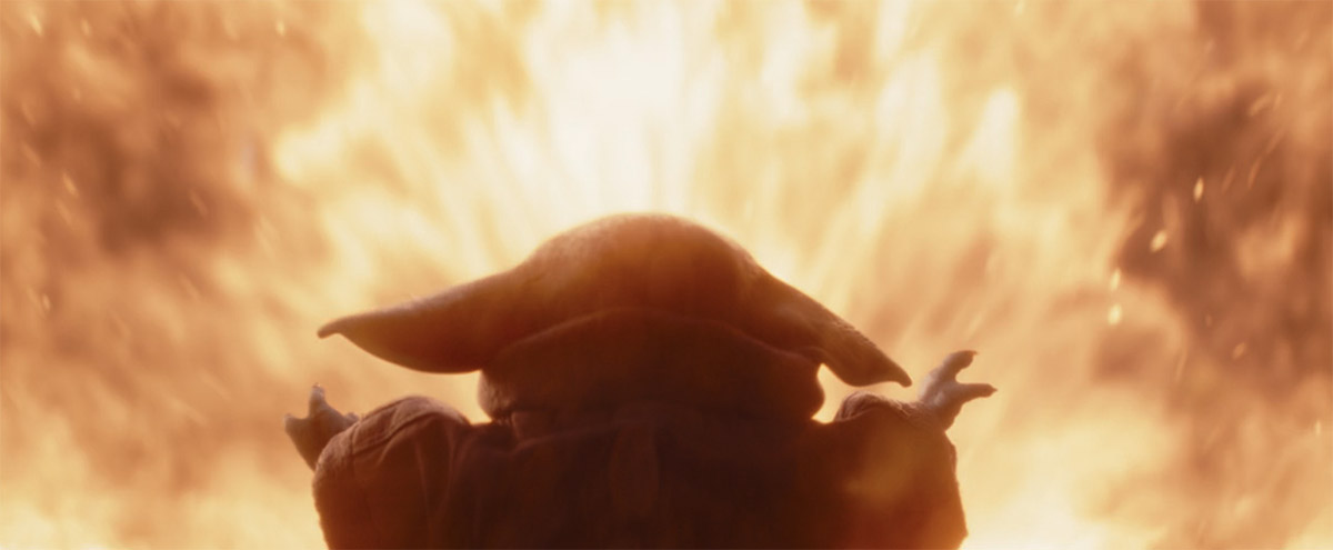 So they’re still at the base when the freighter crashes, and as the fire consumes Moff Gideon, Din and Bo-Katan are protected by Grogu using a Force-field to keep them safe from the flames.