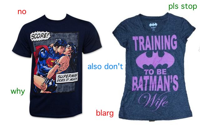 Now on their own, devoid of context, these are not completely the worst. The “training to be ___” is a popular fad in non-licensed fandom-based athletic gear—although most shirts of this ilk usually want you to train to be Batgirl or someone similar, not to marry someone with terrible commitment issues. But together, these are licensed shirts. Somebody at DC decided that it was a really great idea to indirectly depict women as love-obsessed prizes, and then somebody else got the licensing rights squared away, and then they made these and are now selling them for real cash money.