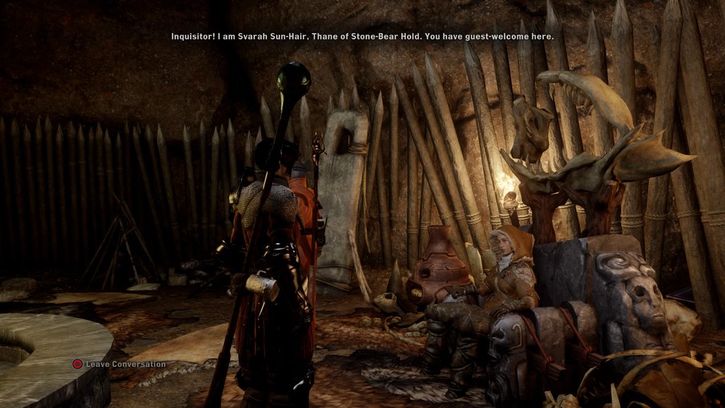 I talk to the Fisherman. We ask to borrow a boat but the Fisherman warns us against going to the Lady’s Rest, the island in the South Kenric wants us to visit. Apparently the island is named for the Lady of the Skies and the Avaar spirits warn them against going there. Dorian puts it succinctly: of course they do. We’re still going there regardless. The Fisherman tells me I need to go to Stone Bear Hold and speak to his Thane Svarah Sun-Hair to gain permission to use the boat. Really? It’s a fucking boat. For all the—do they not know who I am? I am the bloody Inquisitor. I saved the world from would-be-God Corypheus and you won’t let me borrow a boat for a few hours without permission?