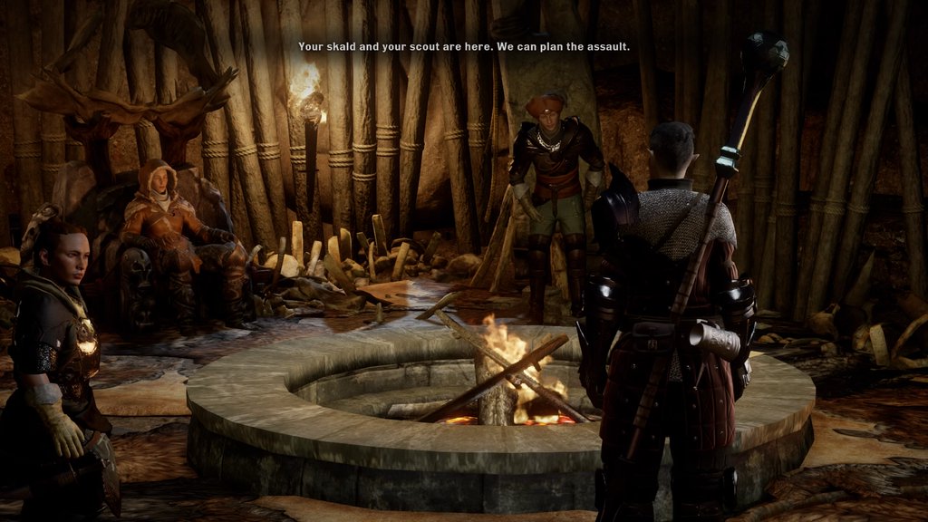 Sun-Hair thanks us for returning Storvacker to them. She’s fuming that the Hakkonites broke their oath and stole their clan beast. Uhh, I’m really not that surprised at all, so I don’t know why you would be, Sun-Hair. A little too trusting perhaps? Their leader, Harofsen, is a total bastard and even I know that having only spent a few moments with him. It’s pretty obvious they would have been actively working against your clan, Sun-Hair. Open your eyes. The good thing about this is Sun-Hair can now help us fight the Hakkonites to get into the Tevinter temple and find Ameridan’s body. Oh, and the loot. There had better be loot. The bad news is that Sun-Hair’s scouts searched the caves where Storvacker was being held and have discovered Harofsen’s plans. They want to bind their God into a mortal form and conquer Thedas. The plan was to bind Hakkon, their God, into Storvacker’s body and use the bear as a vessel. I want to punch something. This again? Didn’t we have enough with Corypheus wanting to be a God?