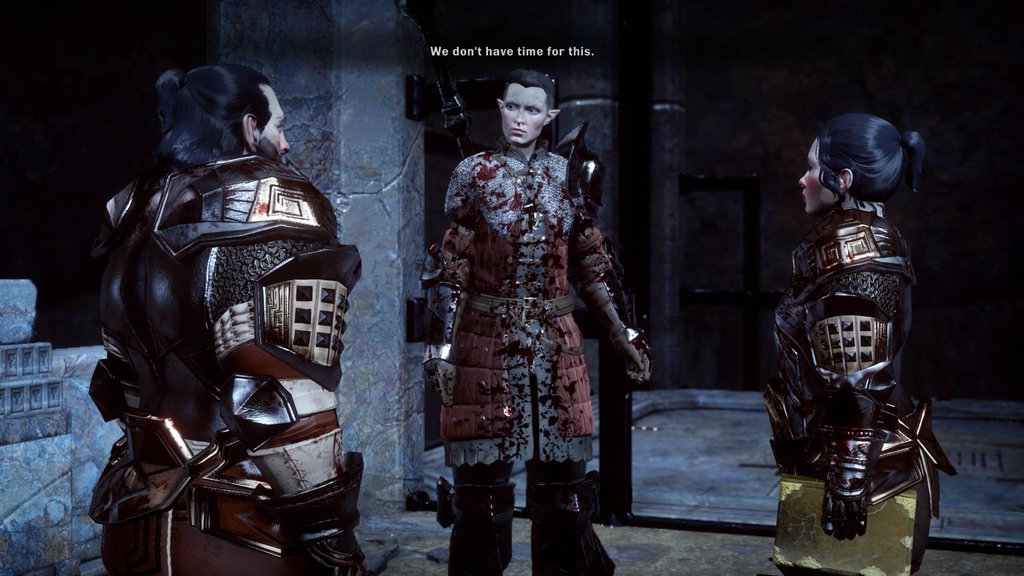 Lo and behold, there’s another fucking elevator to take us even further down. I hope there’s an easier way back. I hope we don’t meet a Titan, and I hope no one sees me jump each time the stone shifts and clangs around us. I’d really like to enjoy my semi-retirement now that Corypheus is Fade-dust. But there’s no such luck, as ever. We descend deeper and deeper, this time below the Thaig itself.