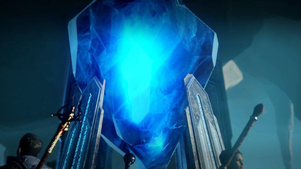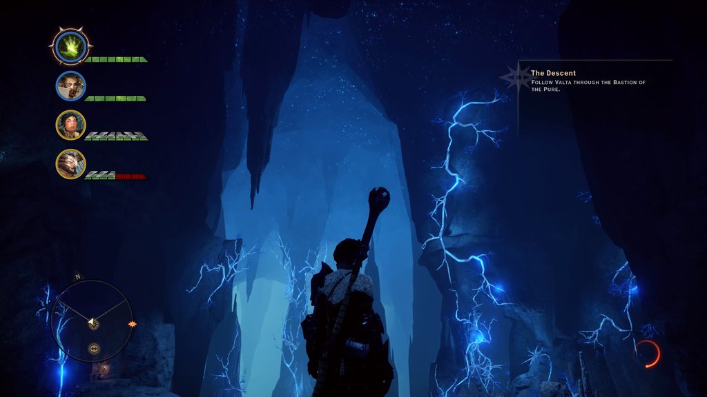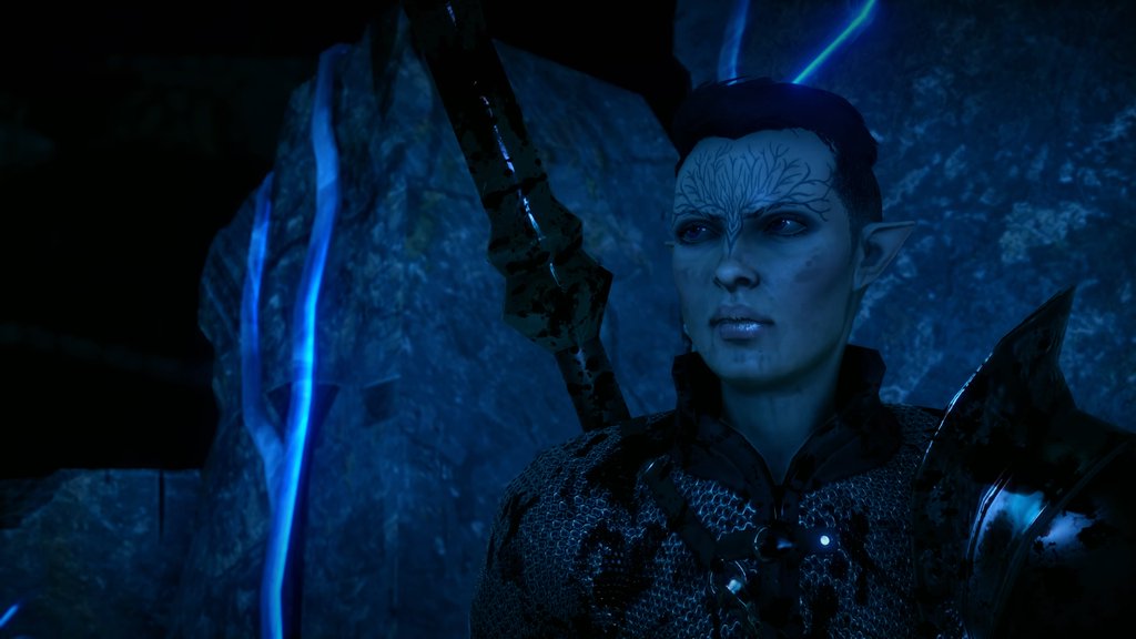 On the other side of the chasm we find another memory wall. It reveals that the Titan is known for shaping and inhabiting the stone. So, if the theory holds true, the Titan is the one likely causing these quakes. Alright, Valta, it looks like you were probably right. I really, really don’t fancy facing one of them. Can we just go home? Valta can go on without us if she likes. I’m actually just about to suggest doing so when Dorian steps slightly ahead of us and gasps. We go to look at what he’s found. I have to admit it’s astonishing. It’s a large cavern full of untapped lyrium veins and they sparkle. Dorian whispers they’re like stars in the sky. Perhaps the smaller ones are, but I’m seeing lightning strikes, veins in the stone. We push on, all thoughts of going back suddenly forgotten.