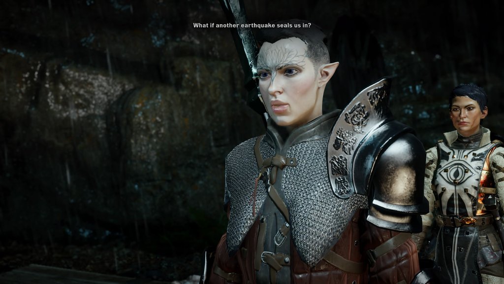 Valta is convinced the earthquakes are being caused by something intelligent, something sentient, because there is a rhythmic quality to them. Interesting hypothesis, but you’ve not a shred of evidence to back up your argument. Also you sound crazy. Here’s an idea: can we just get on with this without having to debate the particulars of the situation? Go find the source and stop it? Apparently not, for Valta explains she found a text on the Titans who are giant creatures. They “sing” into the stone which might refer to the rhythm we’re hearing. It seems like a very far-fetched theory, but okay. Whatever, Valta. Either way, we’ve got to go further deeper into the Deep Roads. There’s another elevator to take us down, and we’ll be accompanied by Renn and Valta as we try to stop the quakes. Stop the Darkspawn.