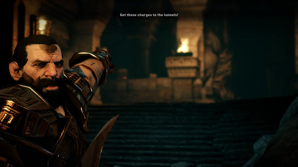 In one tunnel, Valta stops short and exclaims. She’s found a memory wall. She almost recognizes the dialect of Dwarven but it is in an ancient tongue. She identifies a repeated term: Sha-Brytol, or defenders. I suppose that’s the name for these wonderful strangers who keep attacking us. At least I’ll be able to tell those at Skyhold who I’ve annihilated when I get back. I tell Valta we need to keep moving if we want to stop the earthquakes, but will keep an eye out for more memory walls if they’ll give us an edge against them. Perhaps bringing you along was of some use after all, Valta.